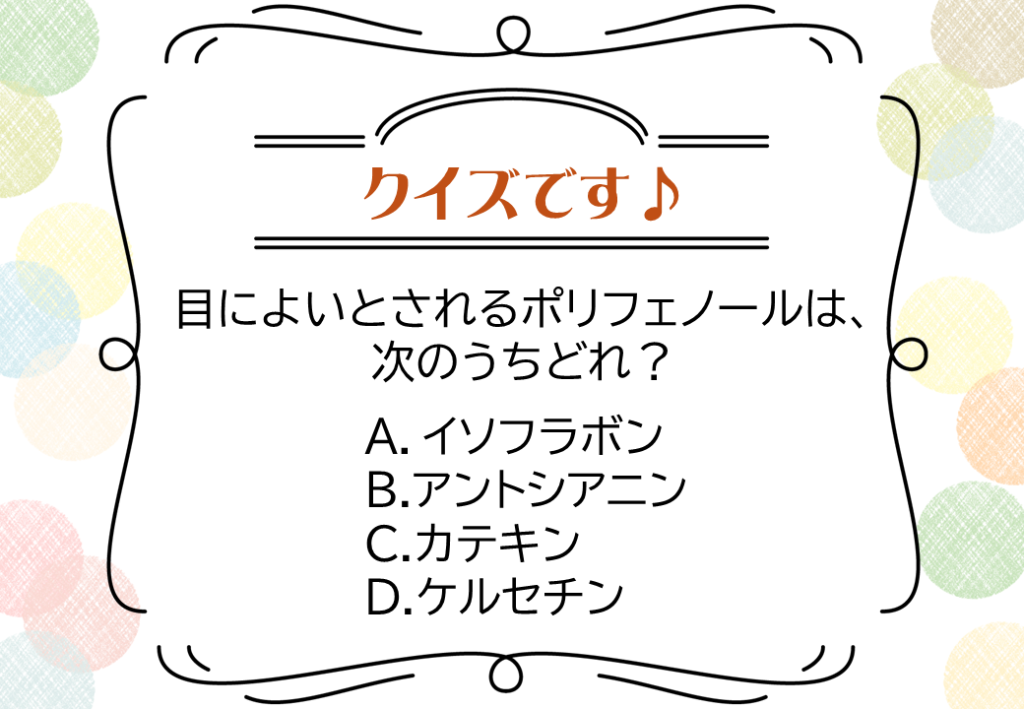 A.イソフラボンは、女性ホルモンのエストロゲンに似た働きをすると言われています。大豆イソフラボンを用いたサプリメントや健康食品が多数販売されています。C.カテキンは、抗酸化作用や抗ウィルス作用などがあります。D.ケルセチンには、抗酸化作用、抗炎症作用の他にも血液をサラサラにする血流改善にも期待ができると言われています。